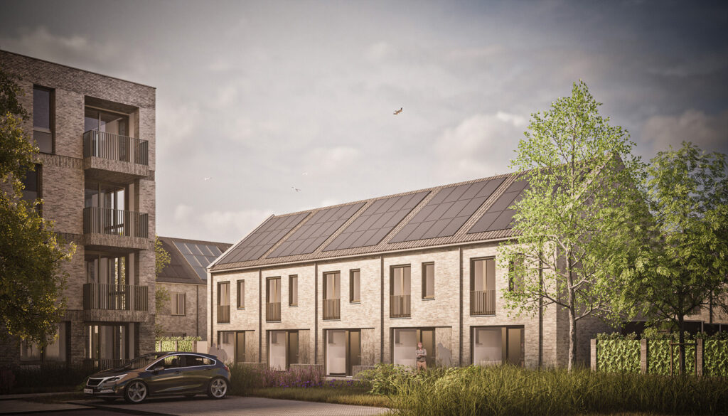 In deze visualisatie opgave is extra aandacht besteed om de connectie tussen de groene locatie en de architectuur van de woningen en appartementen over te brengen. De grondgebonden woningen bestaan uit 4 types die op een eigen manier aansluiten op de openbare ruimte. De aandacht gaat hierbij uit naar een element in de voorgevel met een bankje & plantenbak die de interactie met het buitengebied stimuleren